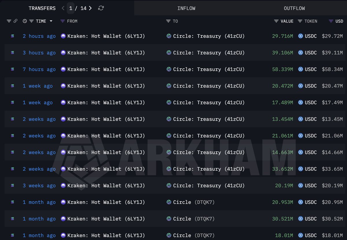 在同一时期,1.35亿 $USDC 从 #Kraken 流向 #Circle,通过钱包 DTQK7G。