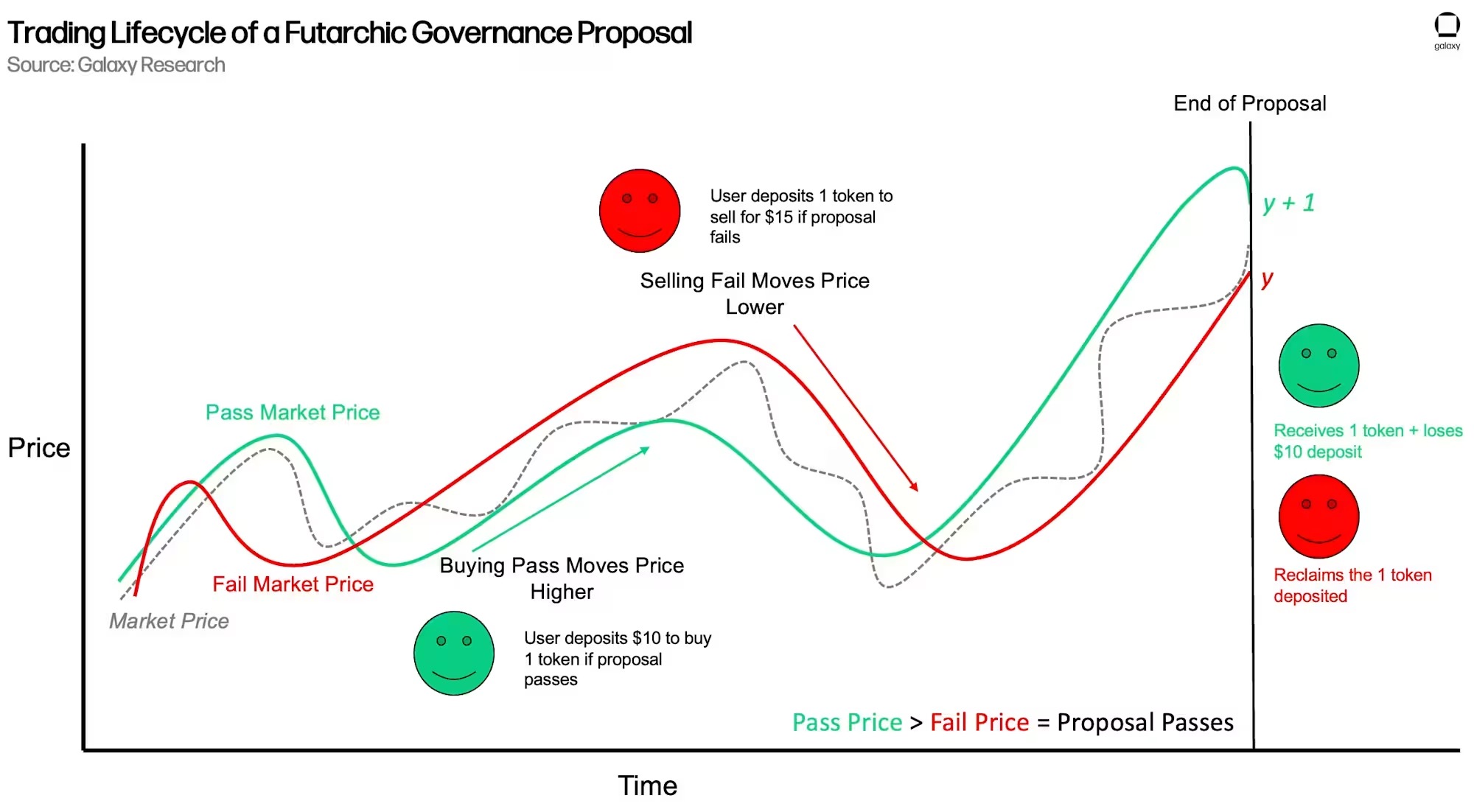 决策市场诞生于经济学家 Robin Hanson 2000 年的工作论文《Shall We Vote on Values, But Bet on Beliefs?》,将影响市场的机制从信息揭示扩展到治理自动化。它们不仅仅是揭示条件性估值以供个人决策参考,而是直接且具有约束力地决定组织是否采取某项行动,其依据是市场对哪种结果的定价更高。 这一机制已在「未来政治」(futarchy)DAO 中得到实践,其决策市场的总交易量已达数百万美元。在典型设置中,组织提出一项决策(例如是否将其代币供应稀释 5% 以资助新的产品线),市场则交易两个条件性「状态」:「通过」与「不通过」。每种状态都为组织的代币赋予各自的价值,其价格作为市场的目标函数——即市场寻求优化的对象。如果市场在「通过」状态下对代币的定价更高,组织则执行该决策。如果「不通过」状态下的代币交易价格更高,提案将被否决,不采取任何行动。市场参与者共同决定哪种行动能使期望价值最大化,他们的交易将基于获胜结果有条件地执行。Galaxy Research 已在关于未来政治及其链上实施的报告中,以及在我们对 2025 年2026 年的年度预测中,报道了这些市场及其应用组织。