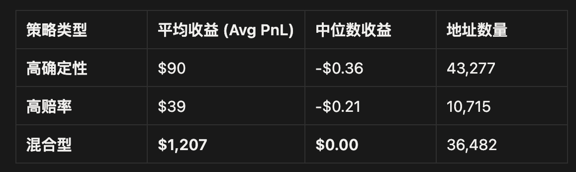数据解读:混合型策略的平均收益是高确定性策略的 13 倍。值得注意的是,所有组别的中位数收益均 ≤0。这意味着,即使在表现最好的混合型组别里,盈利也高度集中在头部玩家手中,绝大多数人并没有跑赢手续费。