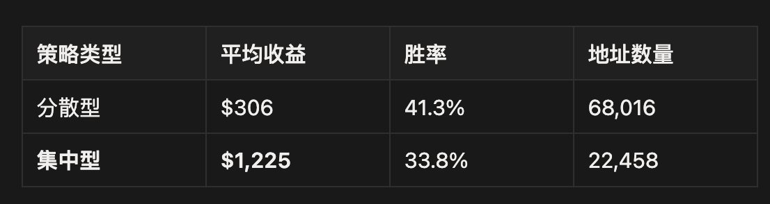 数据解读:集中型策略的平均收益是分散型的 4 倍。但也出现了一个极具误导性的现象: 集中型策略的胜率(33.8%)反而显著低于分散型(41.3%)。这揭示了预测市场中高阶玩家的真实盈利逻辑。