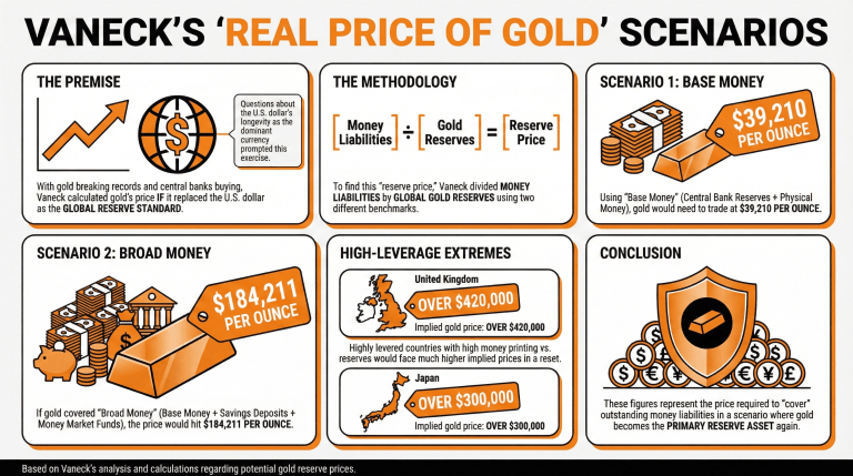 • Vaneck对黄金“真实价格”的分析是什么? Vaneck计算出,在全球储备标准下,黄金的价格可能在39,210美元到184,211美元每盎司之间,具体取决于使用的货币基准。