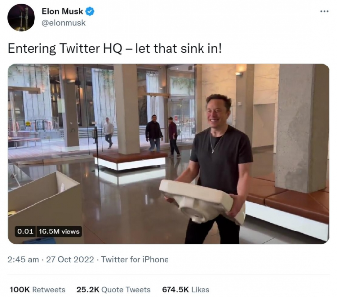 2022 年 10 月 27 日,马斯克走进 Twitter 总部大楼,手里拿着一个洗手盆。