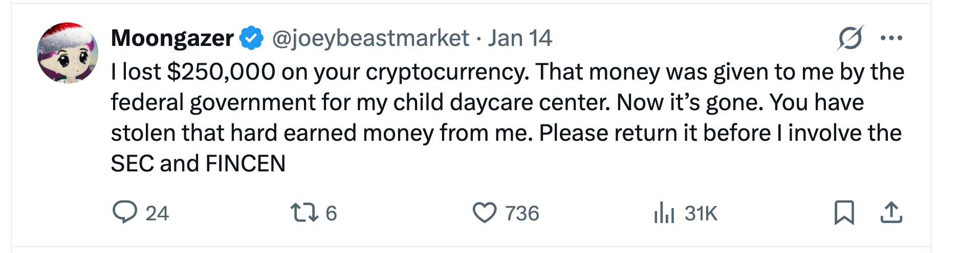 Bubblemaps创始人Nicolas Vaiman表示,截至1月15日,投资 NYC Token 的账户数量总计略超过 4,000 个,大约80%的账户是在该代币正式开放购买后20分钟内买入的。Vaiman表示,这段时间窗口为参与代币发行的内部人士以及其他密切关注新代币的交易者提供了优势。而投资该加密货币的账户大多亏损:15名交易者亏损至少10万美元,而10名交易者净赚10万美元。