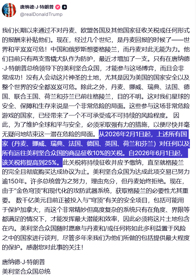 就在美国最高法院还没有对川普政府的关税做出决定的时候,川普为了 格陵兰 自2月1日起对丹麦、挪威、瑞典、法国、德国、英国、荷兰和芬兰征收10%关税。该关税将于6月1日起提高至25% 。且关税将继续生效,直到美国达成购买格陵兰的协议。