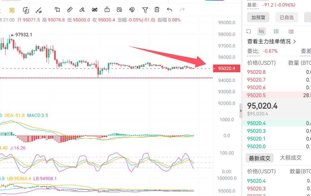 BTC在目前95000美元附近盘整。日线级别量能在萎缩, RSI约50中性,KDJ开始粘合,说明要开始变盘了,靠近布林上轨运行,受上轨97500美元压制,短线下行动能减弱,支撑位93000-94000美元,阻力98000-100000美元。 短线进入收敛口中,警惕变盘风险,94000附近可以轻仓多,96000附近轻仓空