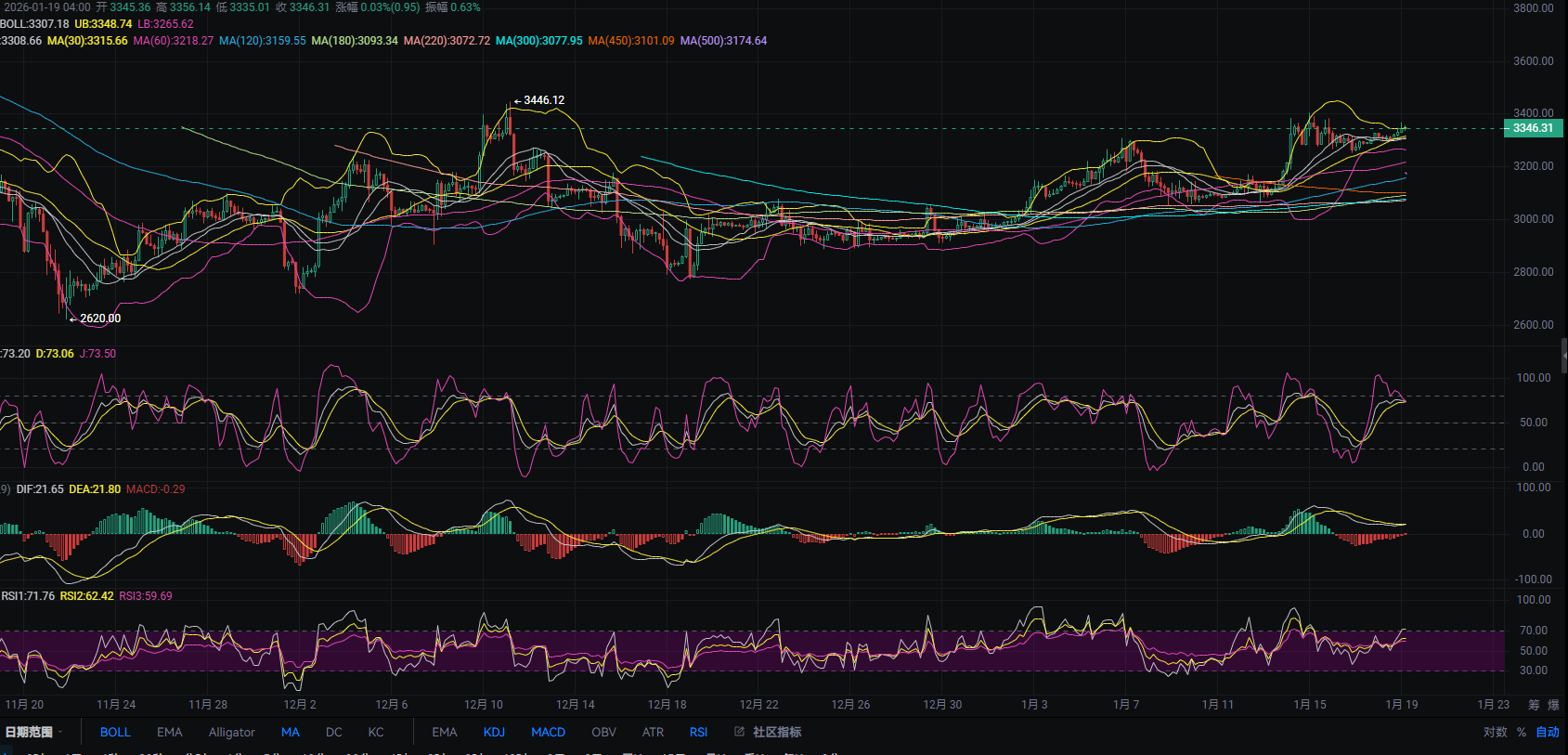 以太坊周末行情再次震荡向上接近上周高点附近!4小时图中k线从下轨扳回到当前上轨位置,MACD中0轴下方缩量,快慢线收口成功有意形成金叉,但也不排除二次背离向下可能!RSI三线向上接近超卖,说明上方空间有但并不大,历辉不建议高位追多,只适合轻仓试空!KDJ三线高位已实现拐头向下存在死叉向下可能!下方第一支撑考虑中轨与MA30区间,破位即可看到前日低点位置!若平行支撑位失效还会走到MA60(3218)可能!今