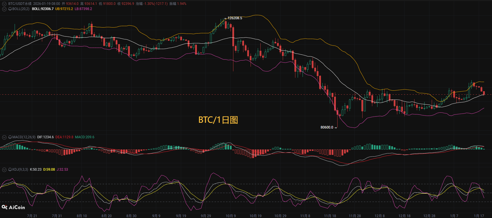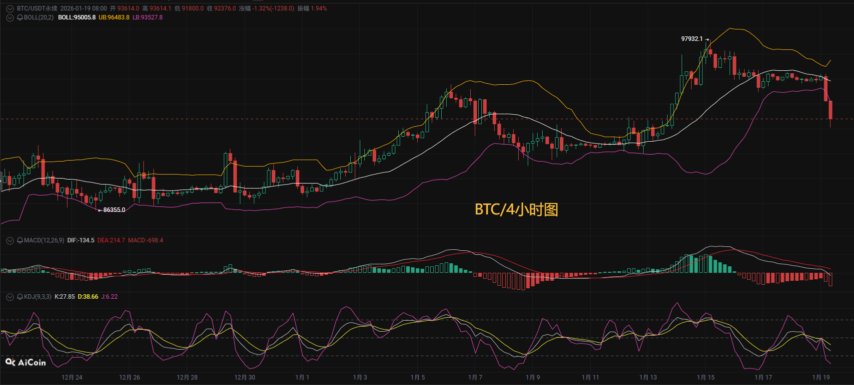比特币日内凌晨整体维持回落走势,前期的震荡区间已经被打破,支撑下移至91500附近位置。目前价格在92500一线运行。日线级别走势还是维持弱势盘整,日内震荡区间在不断压缩,日线级别上来看,目前4连阴,价格自高点97193回落至92550,目前日线布林中轴虚破,形成连续阴线并确立短期下降趋势;