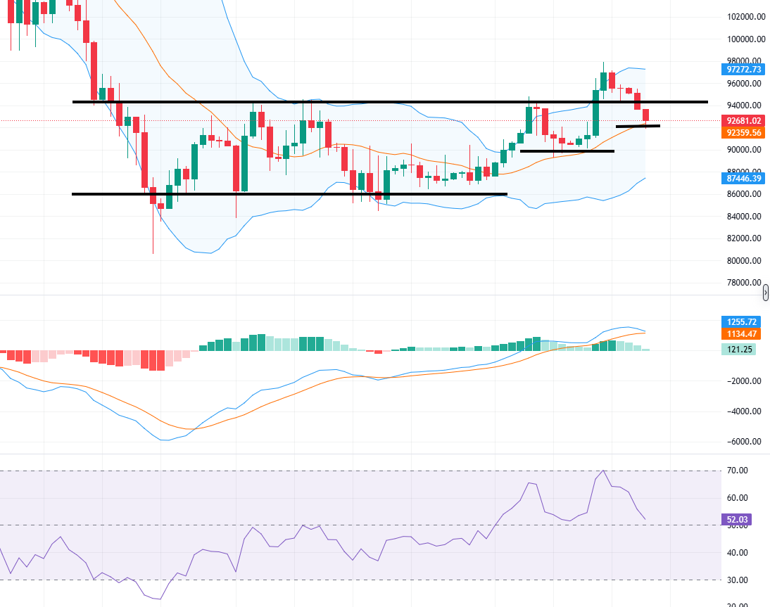 日线级别上,价格连续收阴,回调修复格局逐步强化;但需要注意的是,目前价格已经回踩至日线中轨 92000 附近,该位置短期仍具备一定支撑意义。