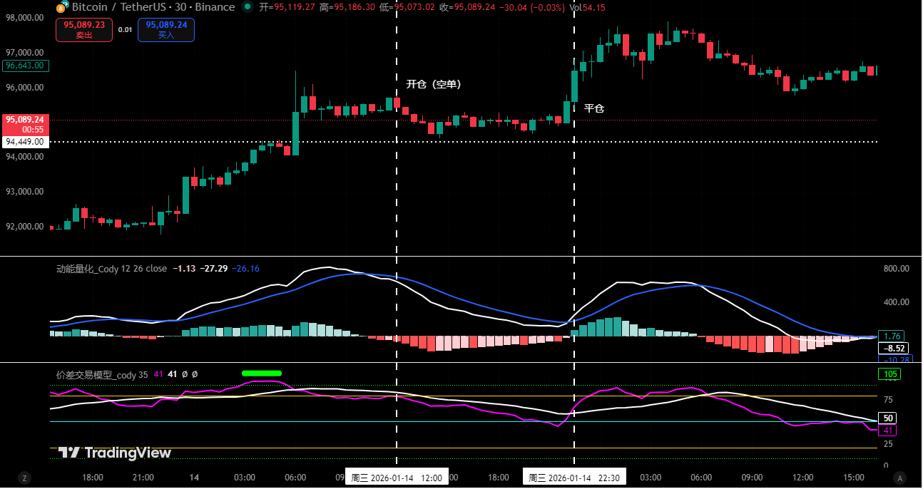 比特币 30 分钟 K 线图:(动能量化模型+价差交易模型)