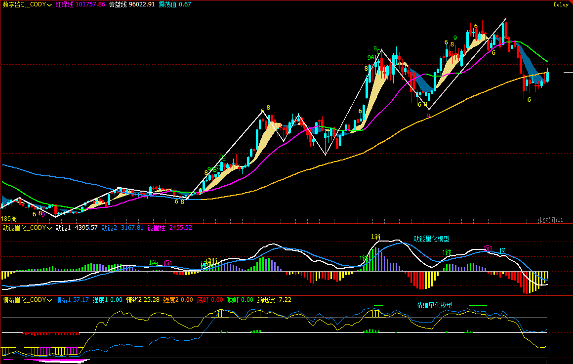 比特币周 K 线图:(动能量化模型+情绪量化模型)