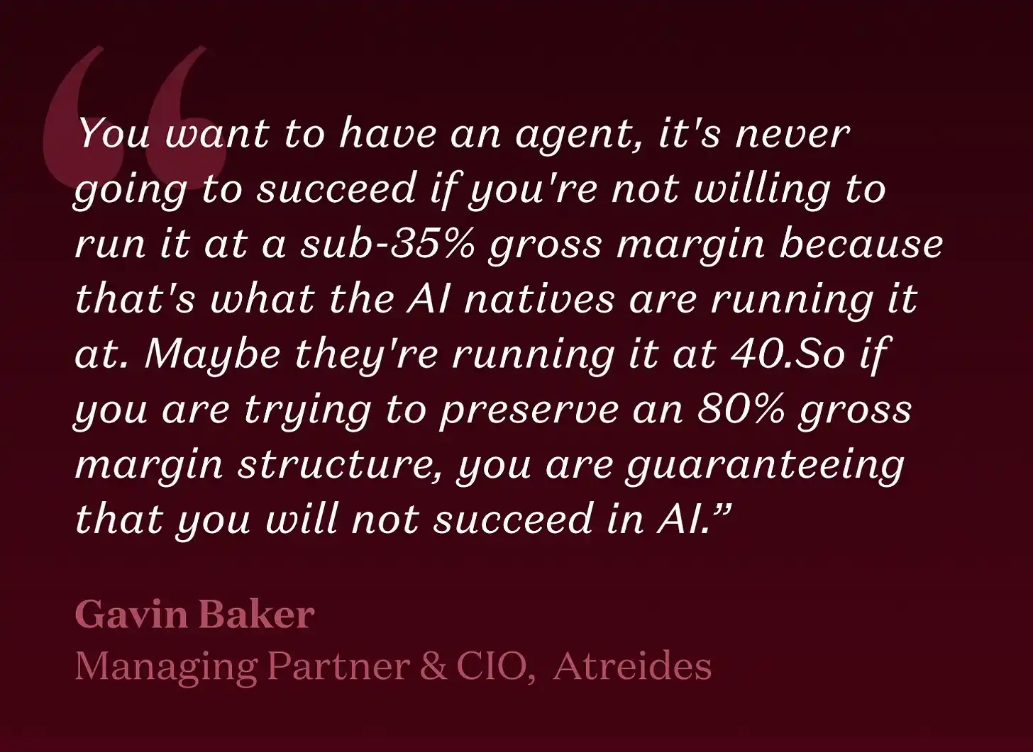 对于某些品类,结构性更低毛利、更高 ACV 的模式是完全理性的。问题在于假装自己是 SaaS,实际上是带着平台的服务公司。投资人通常看的是通向最大毛利润绝对值的路径,而实现这一点的一种方式是量级更大的合同加上更显著的 COGS(销货成本)。