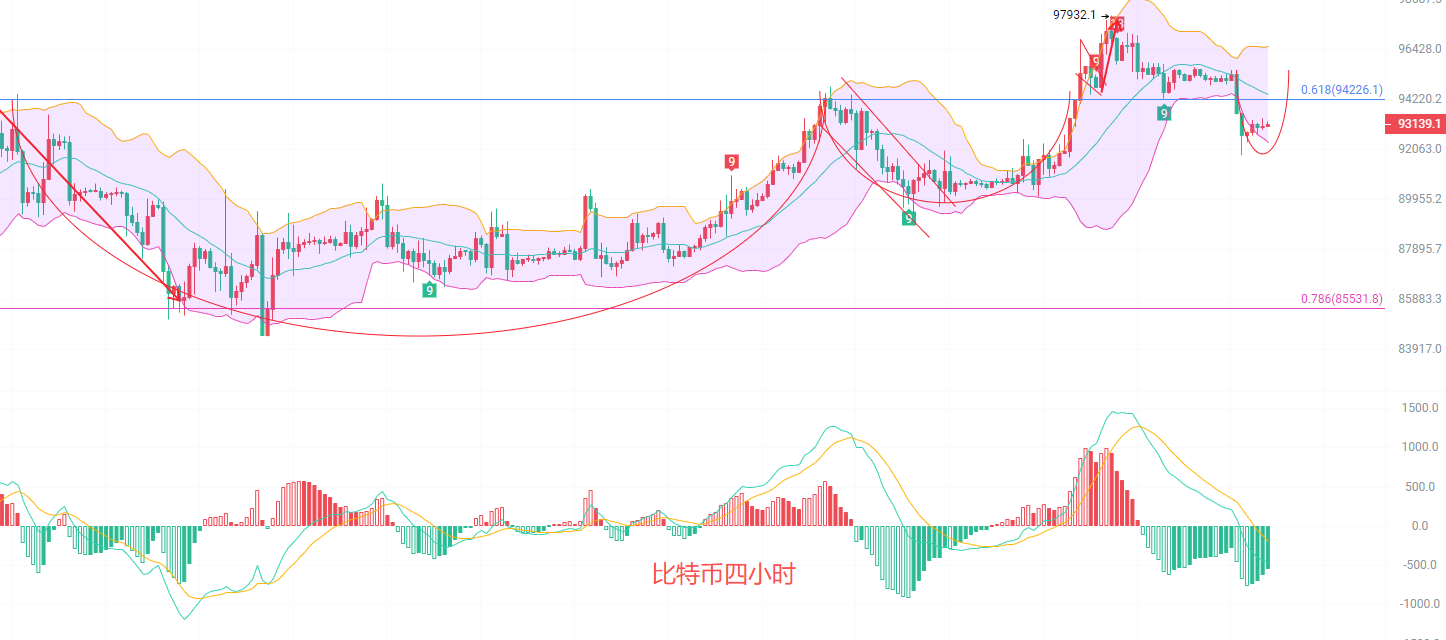 上方94000到94500不破南下,止损400点,目标看93500到93000,破位看92500