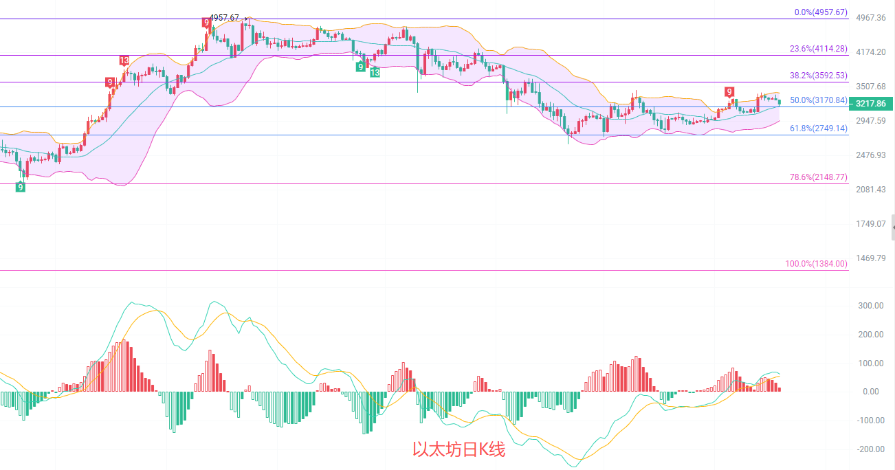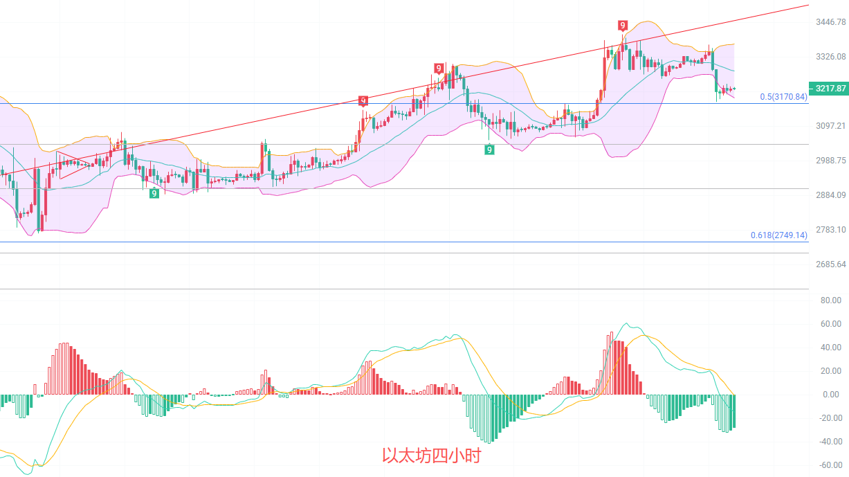 日K线发稿前最高3283最低3175,EMA趋势指标还在向着预定位置收缩,目前回到了趋势底部支撑,按照收缩趋势来看,大概率会在3200附近形成密集区,MACD短线放量减少,DIF和DEA在高点收缩,布林带中规支撑3180有效,上轨关注3400,