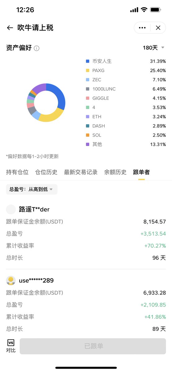 唯一盈利的账号也仅有跟单币安用户“吹牛请上税”