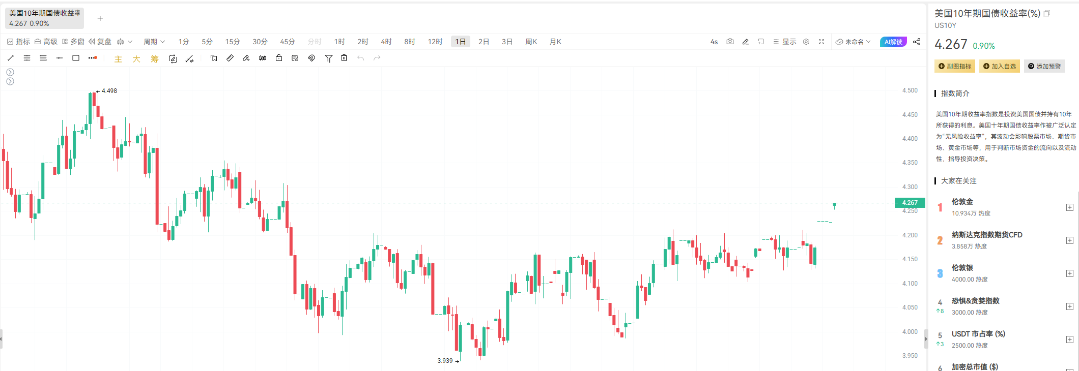美国30年期国债跌幅扩大,收益率上升5个基点至4.94%.由于担忧美联储失去部分独立性恐导致通胀加速,30年期美债收益率一度逼近5%。
