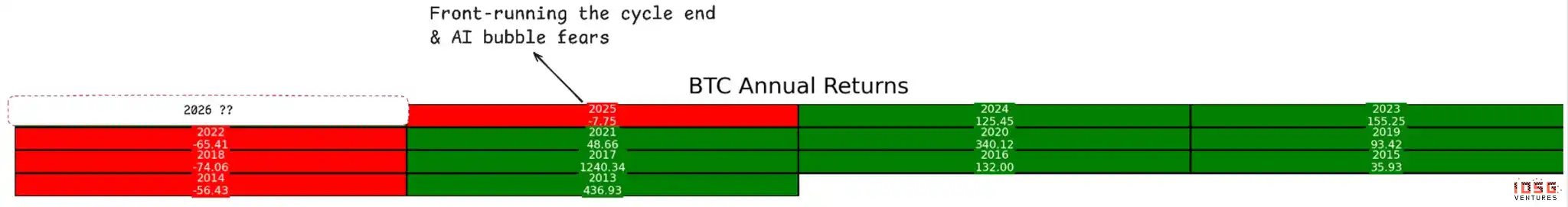 四年周期理论悖论:根据周期理论,我们可能已经处于可以被定义为比特币熊市的阶段。周期理论假设比特币市场以四年为周期轮转,每个周期的峰值通常出现在第四季度。按照这一模式,2025 年第四季度应该是价格峰值——事实上,比特币在此期间达到了 12.5 万美元左右,这可能标志着周期顶部。然而,这一周期理论的有效性越来越受到质疑。我们认为周期理论在某种程度上是巧合,主要与更广泛的宏观周期重叠,而非代表比特币的内在规律。
