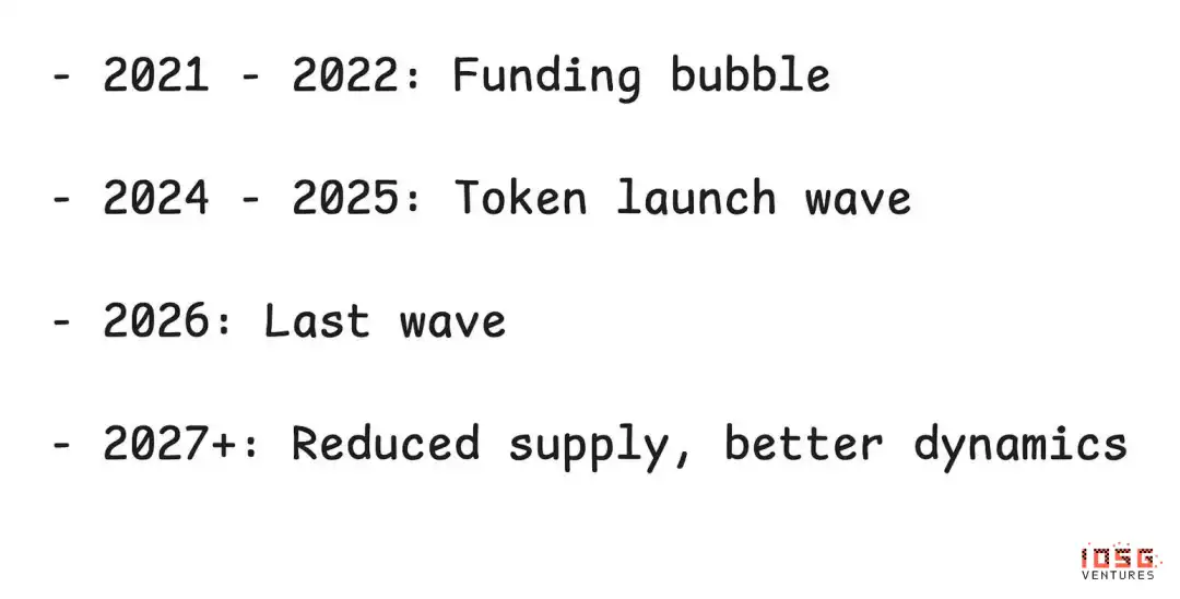 但周期会转向。两年后,一旦 2021-2022 年那批项目被完全消化,一旦新代币供给因当前融资约束而下降,一旦更好的标准通过反复试错涌现——市场动态应会大幅改善。