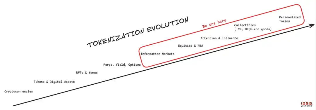 代币化的演进经历了不同的元周期:从最初的加密货币,到代币(如山寨币和数字资产),再到 NFT 和 Meme 币,接着是信息市场(预测市场),以及目前涵盖股票、RWA 以及广泛的金融衍生品。展望未来,前沿领域包括收藏品(如集换式卡牌游戏和高端商品)、注意力和影响力市场,最终是个人化代币。