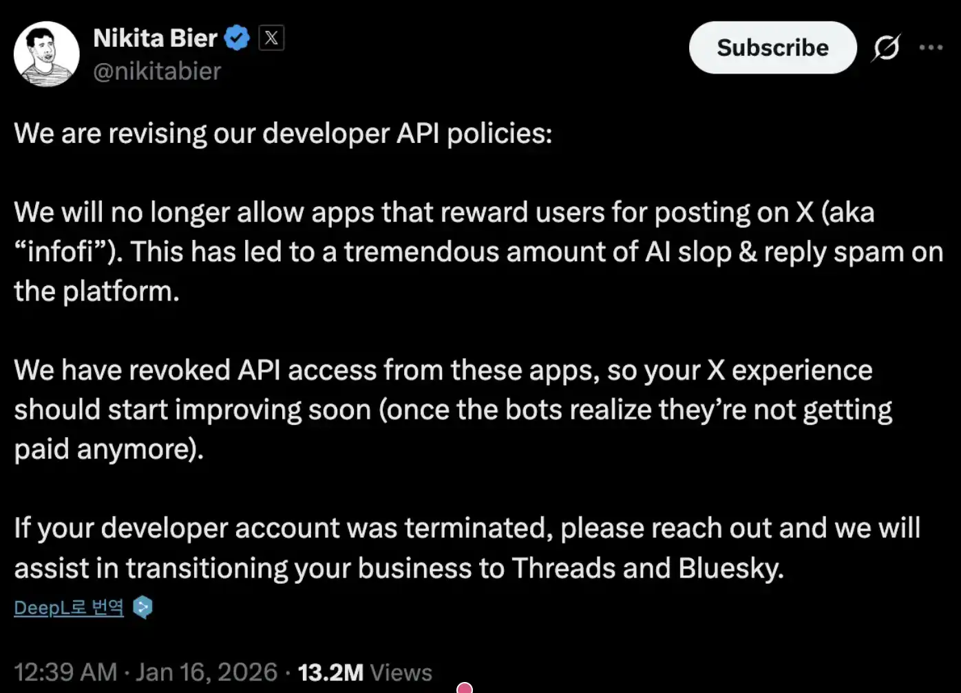 1 月 15 日:Nikita Bier 的公开发帖发布。Kaito 与所有人一样,几乎同时得知最终决定。