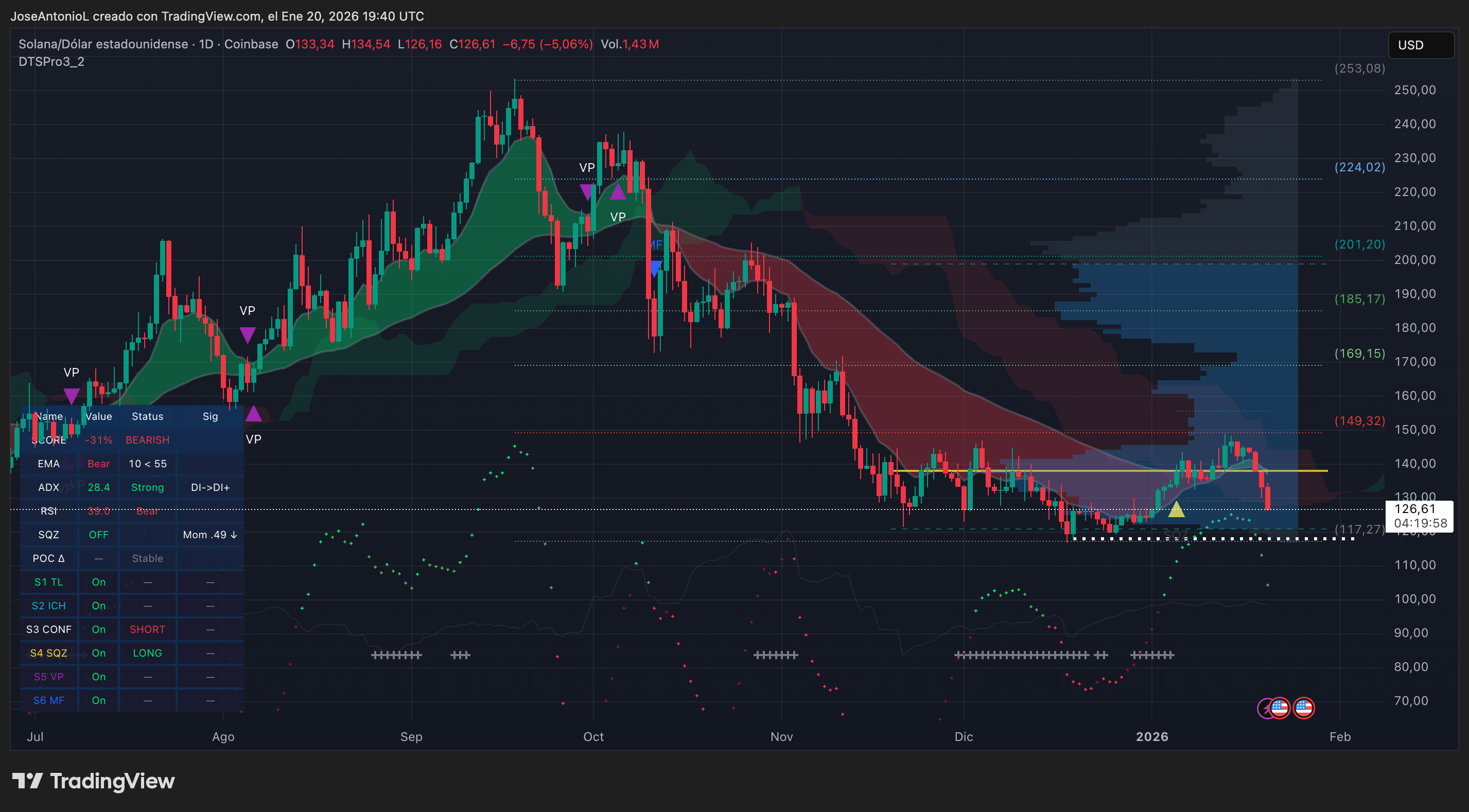 索拉纳跟随比特币的步伐,下跌5.06%,至126.61美元。下面的图表显示,SOL也有力地突破了其200日EMA,技术指标在各个方面都闪烁着看空信号。