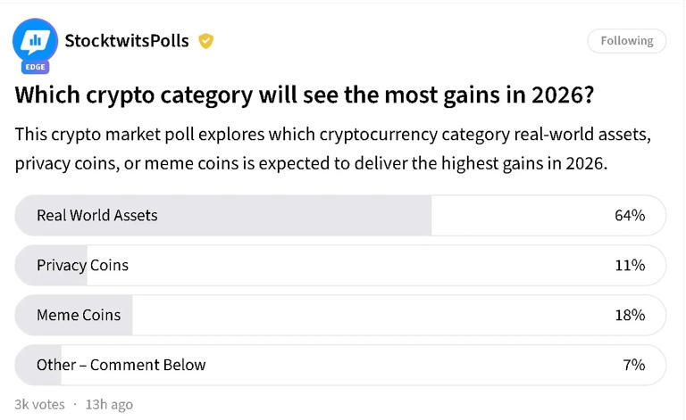 Stocktwits最近的民调显示:64%的投资者认为RWA将在2026年带来最强回报,远超Meme币的12%和隐私币的8%。但这个数字背后藏着一个问题——当散户都开始喊着要配置RWA时,是真的认知升级了,还是只是2025年Meme崩盘后的PTSD反应