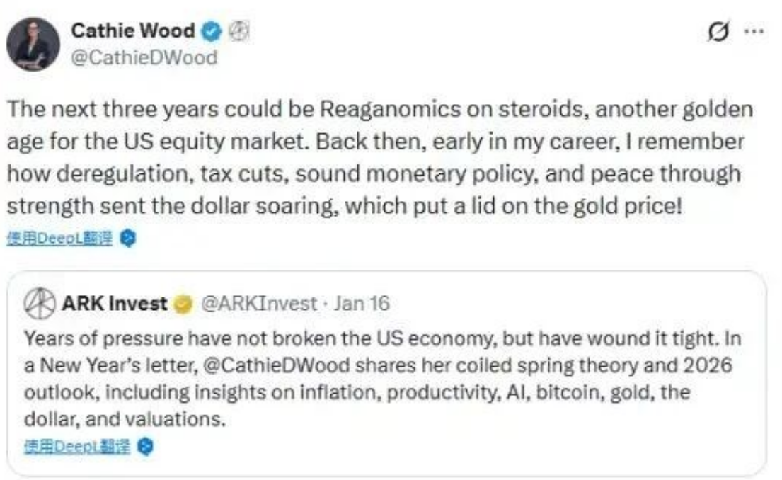“未来三年美国可能迎来一场‘强化版的里根经济学’,”ARK Invest创始人Cathie Wood在新年致投资者信中这样描述她对2026年的展望。