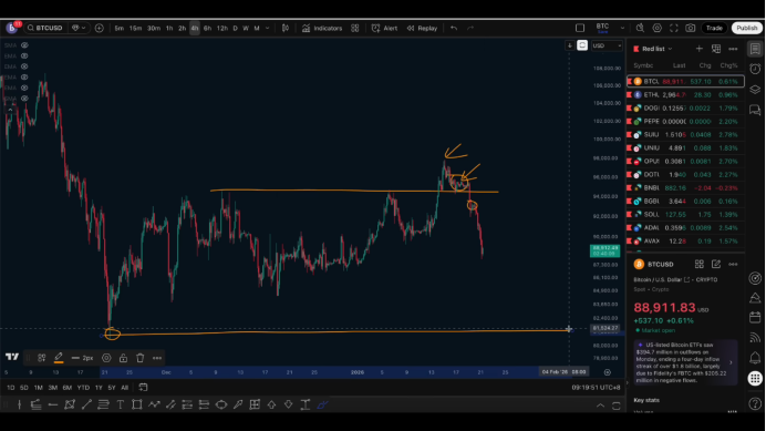 在结构上,94,000是最核心的支撑位,一旦跌破,下方几乎没有有效支撑。此前在这一段形成的买方力量,已经在高点形成后被逐步清算,这也是跌破后行情进入加速阶段的重要原因。