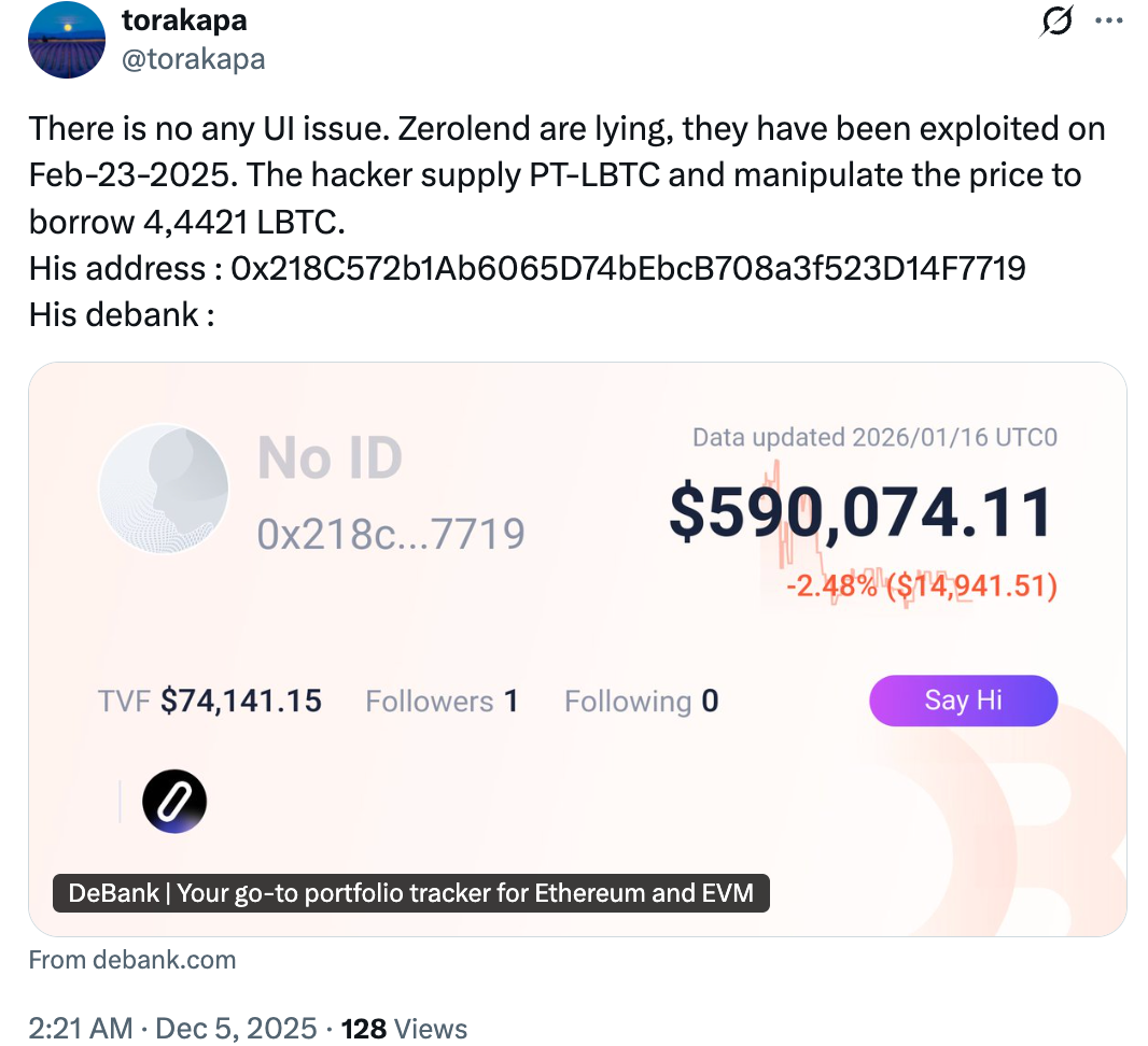 torakapa 在 2025 年末抛出重磅消息:「根本不存在任何用户界面问题。Zerelend 在撒谎,他们在 2025 年 2 月 23 日遭到了攻击。黑客提供了 PT-LBTC 并操纵价格,借出了 4,4421 枚 LBTC。」