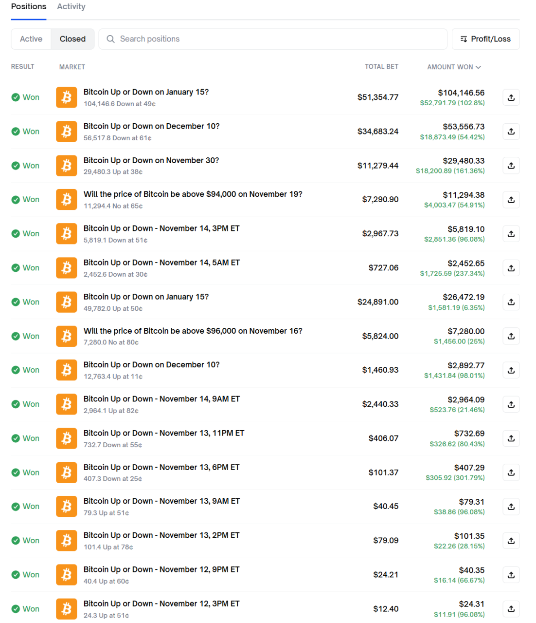这些账户 7 个月前创建,先是绑定随机市场,持续 5 个月,然后 2 个月前同时开始全仓比特币短期市场。