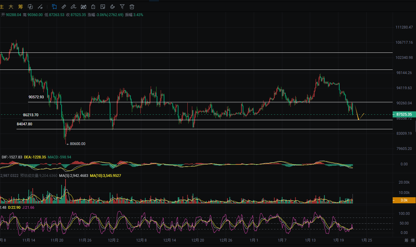 才停更了几天这行情就已经发生了一个180度大转弯,很明显这波冲着多头来的,杀的人心惶惶啊。我复盘看了一下,大饼直接跌破了9万这个重要关口,那么,如果此时你还在一味看多持多的话真的很危险了,顺势而为及时转变在操作中太重要了,不然离消失就只是一瞬间的事。这波下跌,谁看谁激动,我也不得不惊叹它的威力,已经打破常规了,接下来周尾的两天更要谨慎,一旦86000失守,那么后面只会一发不可收拾,所以多军们一定要注意节奏,不要像以往一样盲目的扛单以为就能扛回来,这次是不一样的。