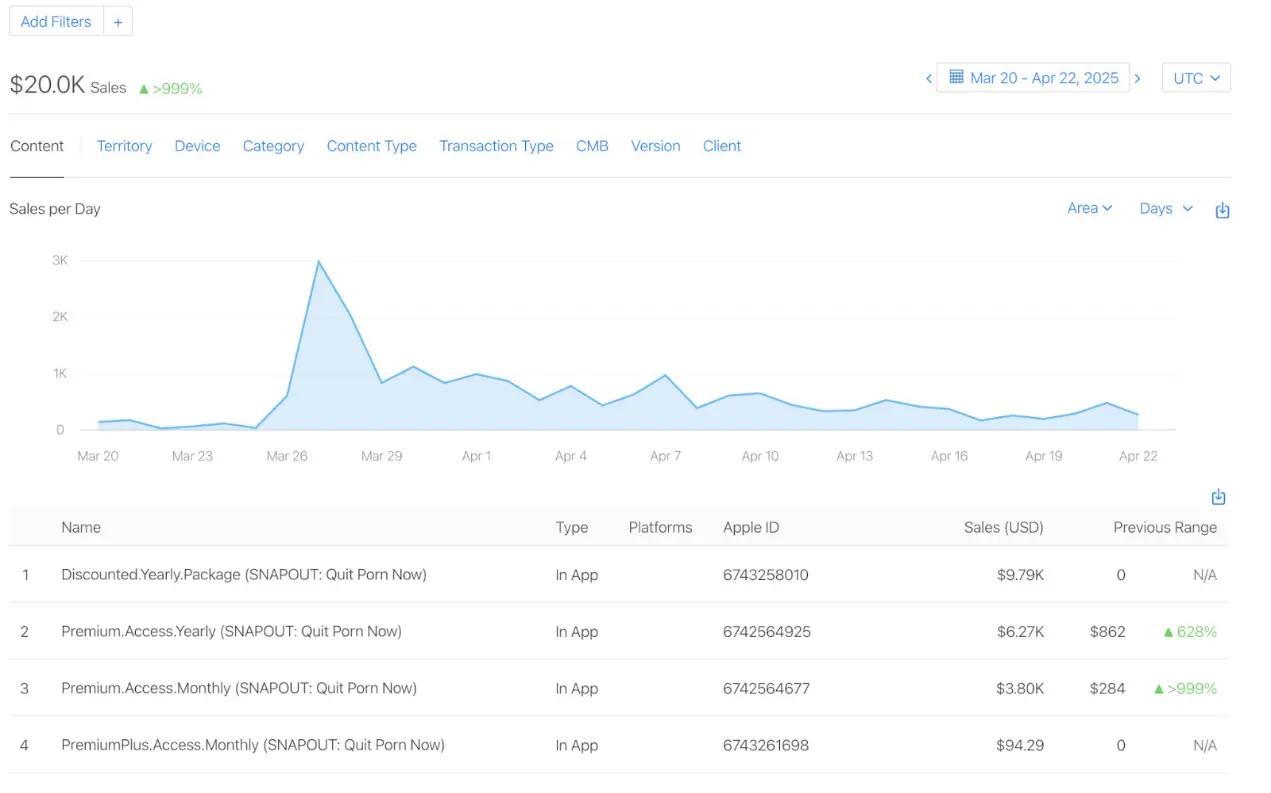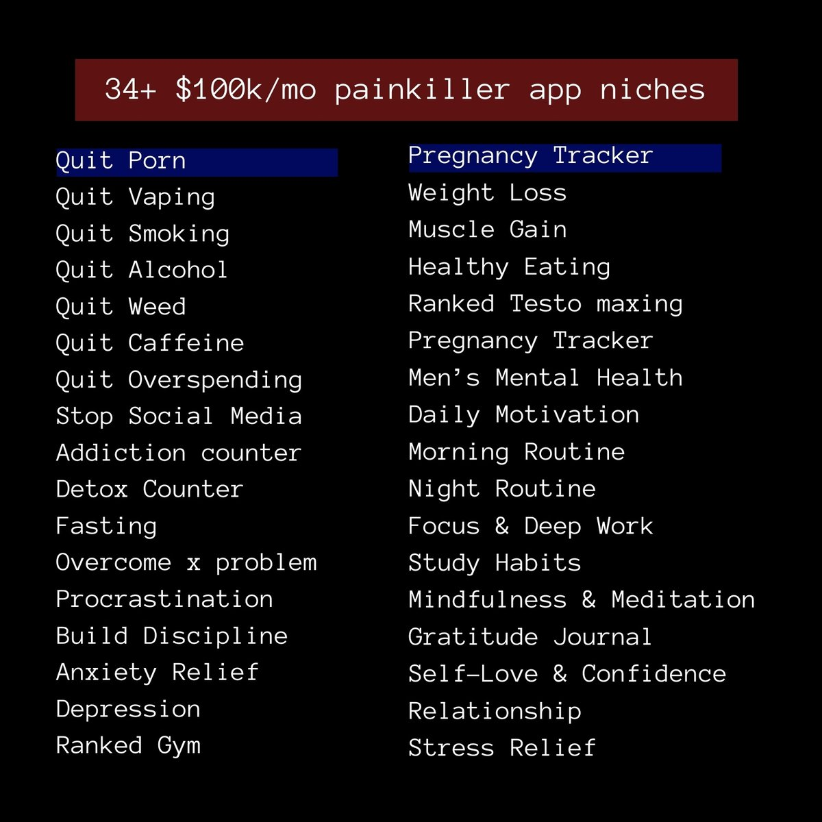(34 个月收入超 10 万美元的细分应用领域:戒色、戒电子烟、戒烟、戒酒、戒大麻、戒咖啡因、戒过度消费、戒社交媒体、戒断计数器、解毒计数器、禁食、克服 X 问题、克服拖延症、培养自律、缓解焦虑、抑郁症、健身房排名、孕期追踪、减肥、增肌、健康饮食、睾酮最大化、孕期追踪、男性心理健康、每日动力、晨间习惯、夜间习惯、专注与深度工作、学习习惯、正念与冥想、感恩日记、自爱与自信、人际关系、压力缓解)