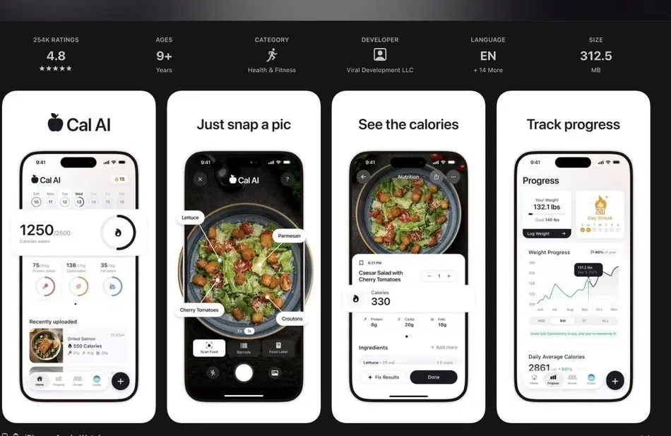 屏幕截图是转化的关键,应该清晰明了,直奔主题,字体要大,每屏只展示一个概念,界面要简洁。像 Cal AI(月入 360 万美元的应用)那样: