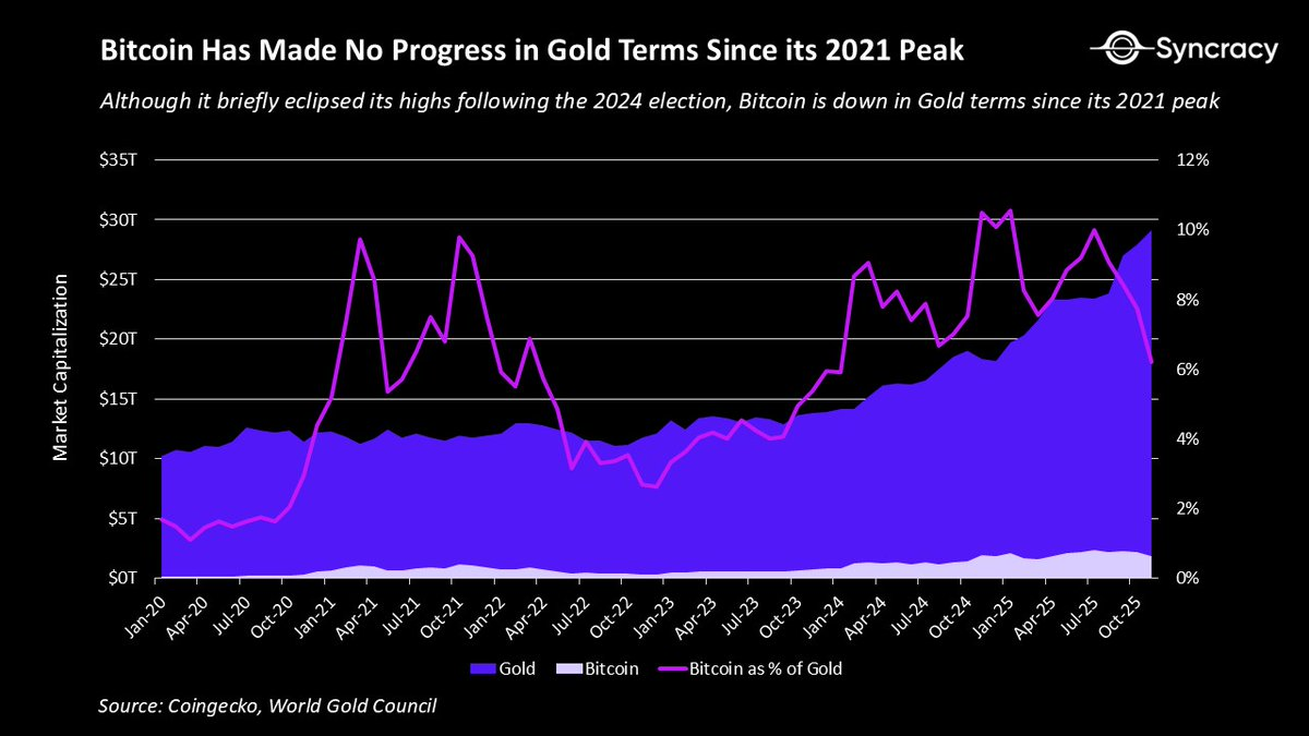 尽管我们取得了长足进步,但比特币兑黄金的价格自 2021 年以来从未创下新高,实际上还处于下跌状态。谁能想到,在特朗普(Trump)口中的全球“加密首都”,在历史上最成功的 ETF 上市之后,在美元被系统性贬值的同时,比特币作为数字黄金的成功程度竟然还不如四年前?