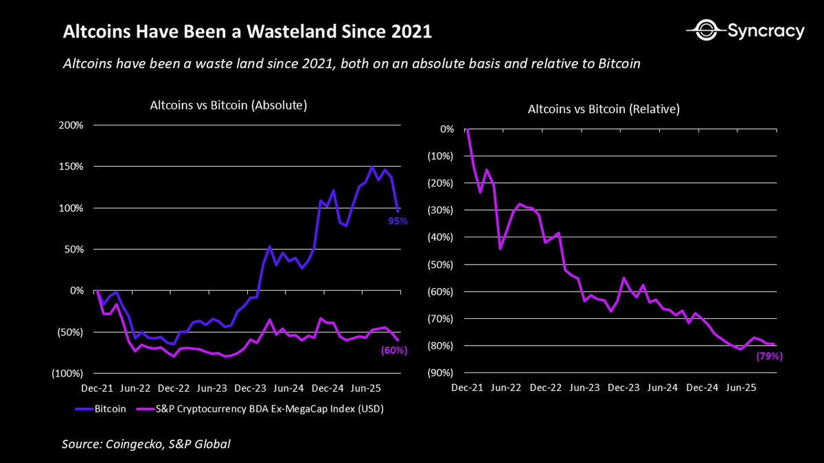 - 由于山寨币(Altcoins)经历了长达四年的熊市,市场情绪跌至谷底,顶级项目的多年期机会被市场错误定价,很少有分析师在建模中考虑指数级增长。