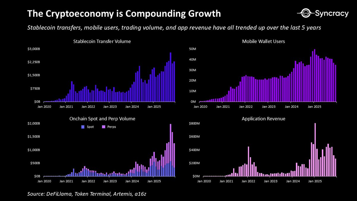 我加入这个行业的八年里,加密经济正处于我所见过的最大转型期之中。机构正在积累筹码,而先锋密码朋克(Cypherpunks)则在实现财富多元化。企业正在为 S 型曲线(S-curve)增长做准备,而感到幻灭的行业原生开发者正在离场。各国政府正在将全球金融转型引导至区块链轨道上,而短线交易者仍在担心图表上的线条走势。新兴市场正在庆祝金融民主化,而美国的愤青们则在哀叹这不过是一场赌场游戏。
