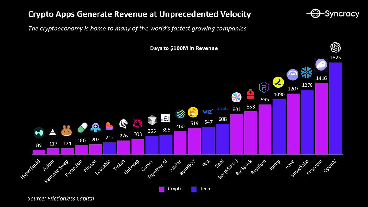 在此背景下,胜出的区块链正逐渐显现为互联网的货币与金融基石。随着时间的推移,Ethereum(以太坊)、Solana 以及 Hyperliquid 的网络效应日益增强,这得益于它们不断增长的资产、应用、业务和用户生态系统。它们的无许可设计和全球化分发,使得其平台上的应用成为世界上增长最快的业务,拥有无可比拟的资本效率和收入周转速度。从长远来看,这些平台很可能会支撑起金融超级应用(Financial superapp)的总体潜在市场(TAM),而这正是目前几乎所有领先的金融科技公司都在争夺的领域。