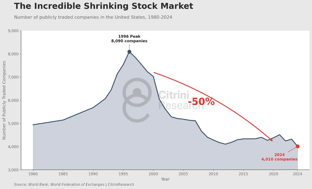 1996 年,美国有超过 8000 家上市公司。尽管如今经济规模呈指数级增长,但上市公司数量却不足 4000 家。
