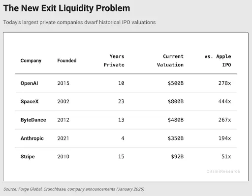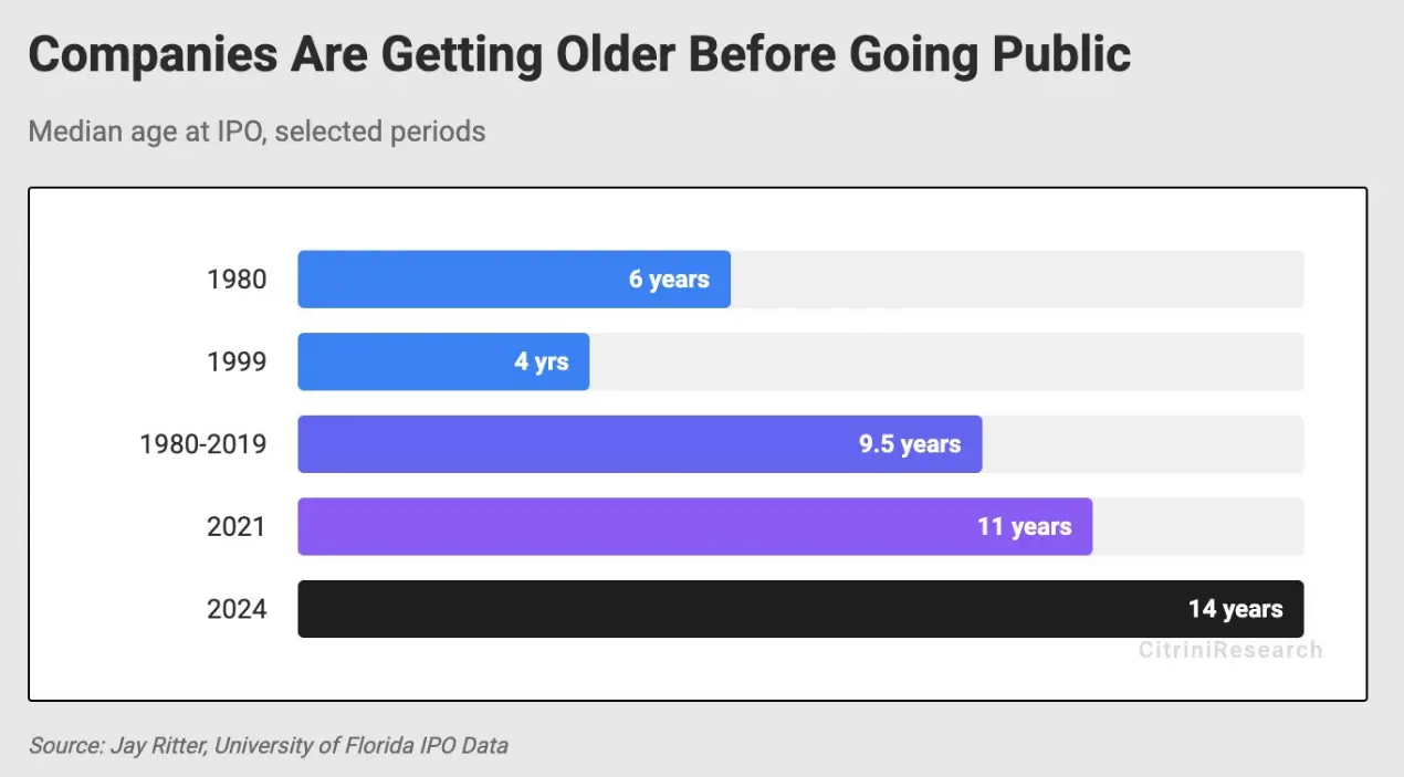 散户在股票市场获得高额收益的机会越来越渺茫,究其原因或与企业延迟上市有关。研究机构 Citrini 发文探讨了现代资本市场中公司倾向于长时间保持私有状态的问题,导致增长价值主要被 VC 机构捕获,公共市场或已沦为流动性退出工具。以下为内容详情。