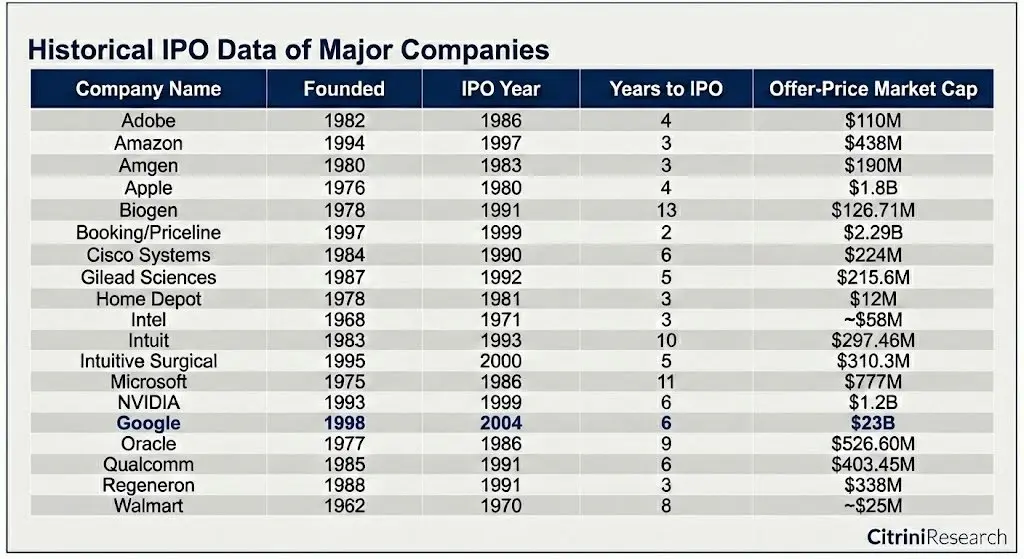 即使是市值最高的 IPO 公司——谷歌(230 亿美元),也只是当时前 100 大公司中的垫底水平。