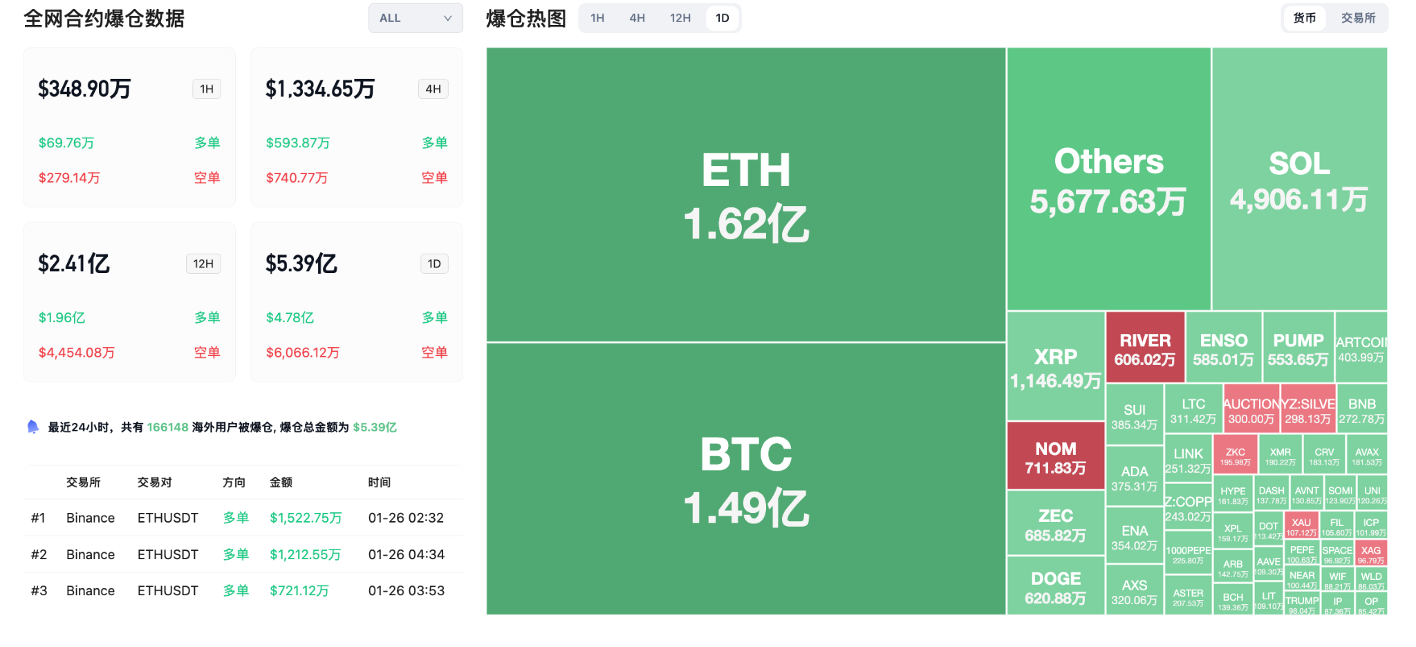 24小时爆仓数据:全球共166148人被爆仓 ,爆仓总金额为5.39亿美元,其BTC爆仓1.62亿美元、ETH爆仓1.49亿美元、XRP爆仓1146万美元