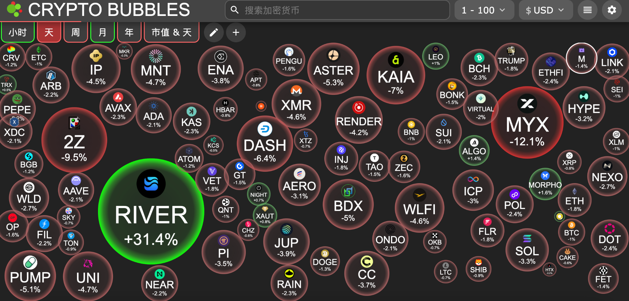 今日市值前100币种最大涨幅:River涨31.4%、Morpho涨1.6%、Algorand涨1.4%、LEO Token涨1%、Tether Gold涨0.8%。