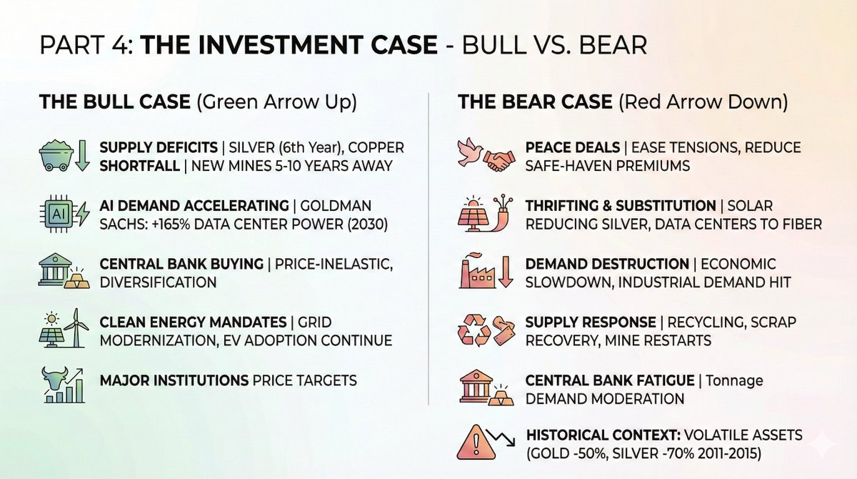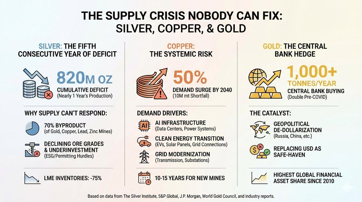 供应赤字持续:白银预计将在2026年迎来连续第六个赤字年。铜的短缺正在扩大。新矿供应需要5到10年才能投产。