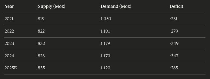 自2020年以来,白银市场从未实现过供需平衡,而且情况还在恶化。