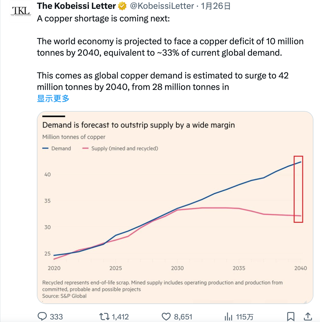 标普全球在2026年1月的报告中预测,到2040年,全球铜需求将飙升50%,从2800万公吨增至4200万公吨。而供应增长却趋于平缓甚至下滑。