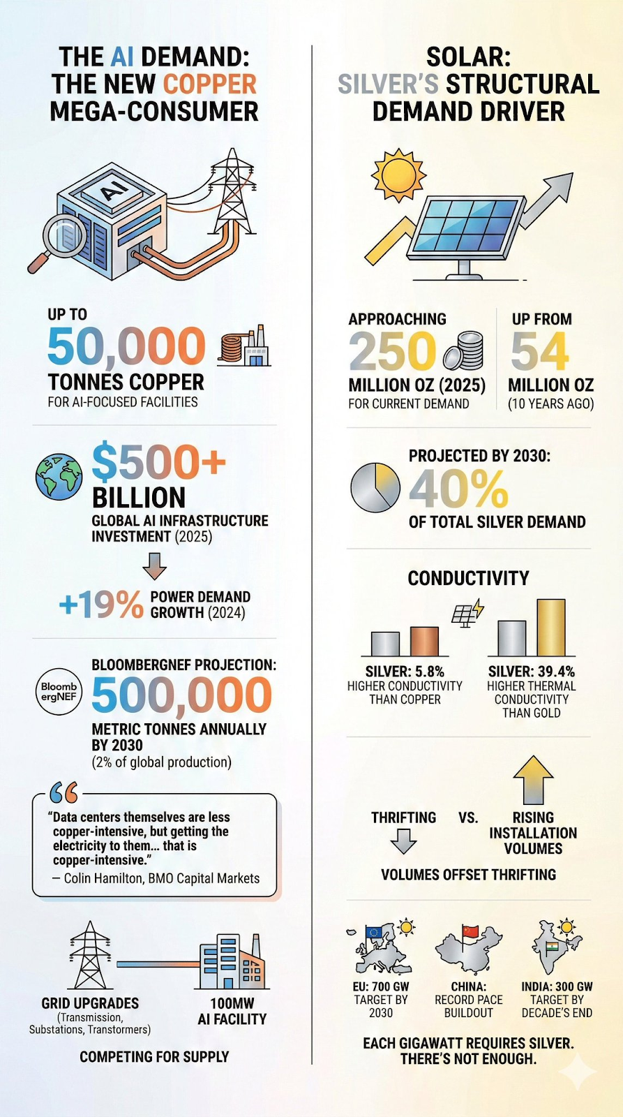 “数据中心本身的铜密集度正在逐步降低,但将电力输送到数据中心的过程,却是极其耗铜的。” ——科林·汉密尔顿(Colin Hamilton),蒙特利尔银行资本市场(BMO Capital Markets)