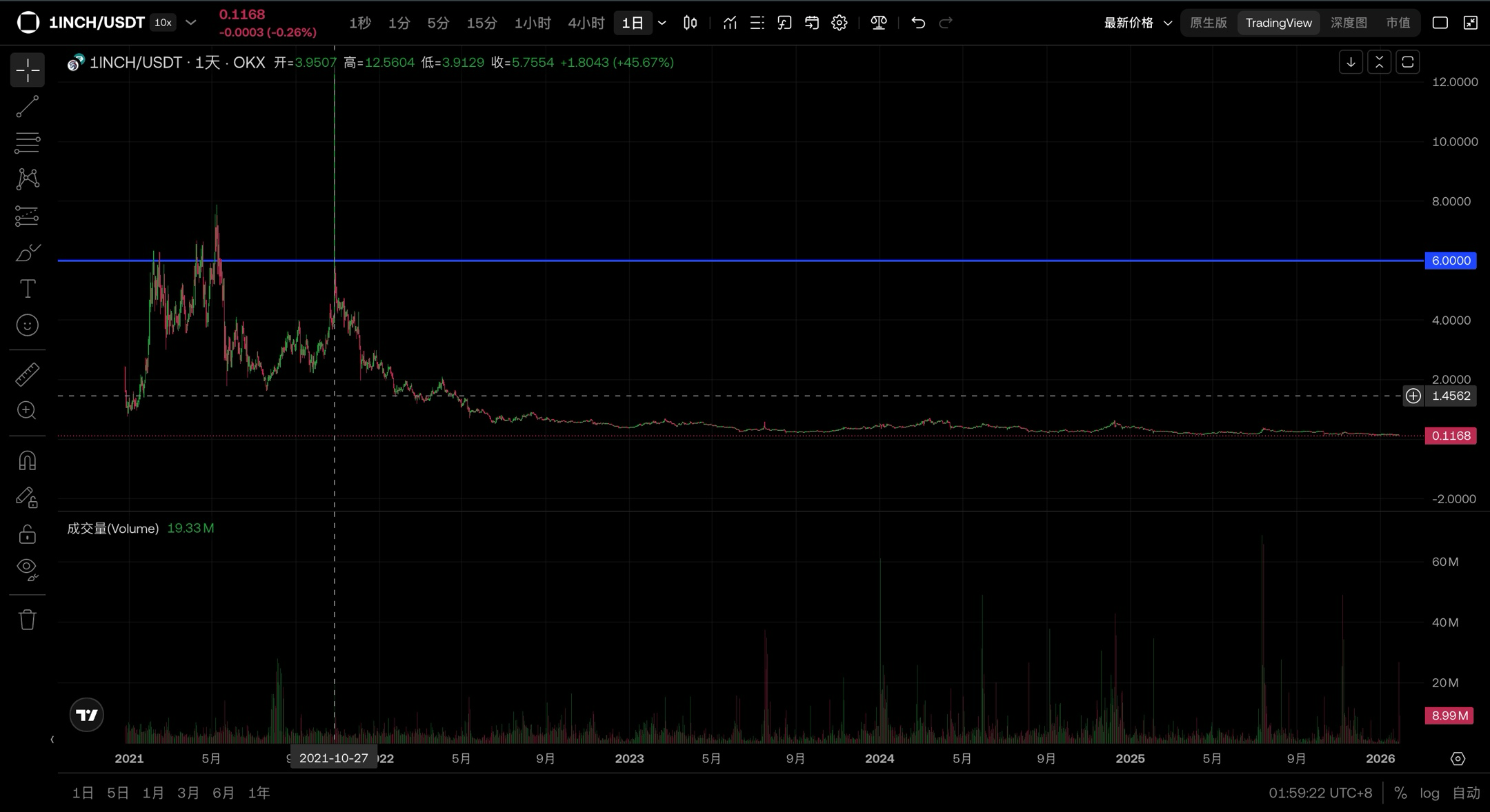 然而,即便最终被证明是一场误读,这次卖出对 1INCH 本就持续走弱的价格而言,依然构成了现实层面的二次冲击。自上一轮周期高点6 美元起,1INCH 已经历了长期的单边下行,如今徘徊在0.11 美元附近。