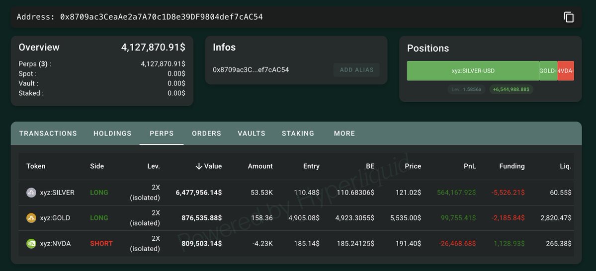 鲸鱼0x8709不仅在购买现货黄金——他还在做多白银和黄金,同时做空$NVDA。