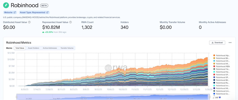 Robinhood 的代币化美国股票和 ETF 现已面向欧洲客户开放。每个代币均在 Arbitrum 网络发行,由 Robinhood 持有的股票全额支持,并可实现 24/5 全天候交易且零佣金。相关数据可在 RWA.xyz 上获取。
