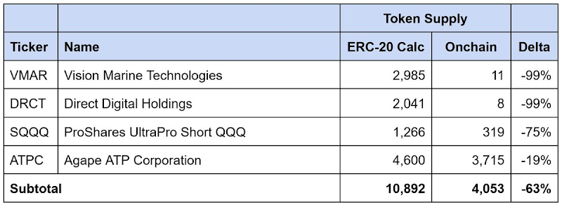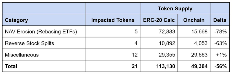 在我们识别出的 21 种数据不匹配的代币中,报告的供应量被高估了约 64,000 枚,差异高达 56%。高收益 ETF 造成的净值侵蚀约占这一差距的 90%,反向股票拆分则解释了剩余的部分。