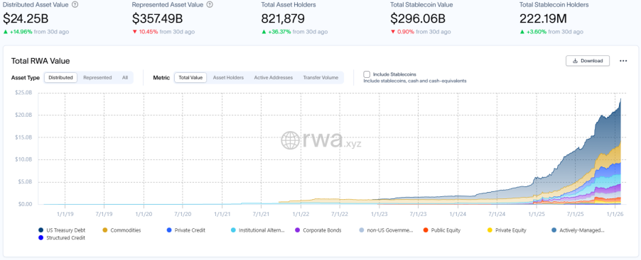 RWA.xyz 最新数据披露,截至2026年1月30日,RWA 链上总市值达242.5亿美元,环比上月同期上升14.96%,增速创近期新高;资产持有者总数增至约82.19万,环比上月同期大涨36.37%,呈现显著增长,反映市场参与度快速提升。